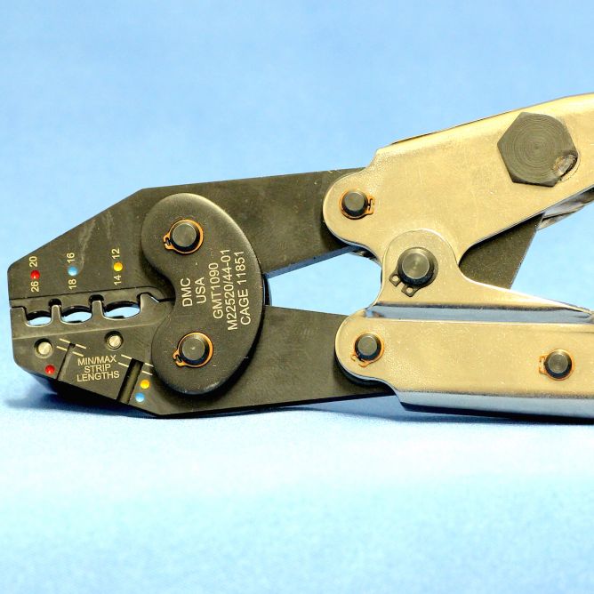 GMT1090 (M22520/44-01) 手动压接工具可压接 TE Connectivity 的冷应用环境接头 (M81824/12-1、-2、-3),尺寸为 26-20、18-16、14-12 AWG来源是不允许的。使用 G1122 (M22520/39-03) 三步 GO/NO-GO 量规对其进行检查。这种精确的工具有一个定位器,该定位器被配置为在任一导线端接时将接头保持在正确的位置。该工具的坚固结构确保了可重复性和较长的生命周期。