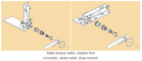 在装配特殊电缆组件的时候,如果需要测量力矩,可以使用静态力矩仪轻松的完成。适配器安装在力矩仪的方形驱动器上,这种工装可固定连接器,使用皮带扳手将力矩施加在后附件上。当力矩达到设定的数值时,会有信号灯点亮提示操作者已使用期望的力矩。