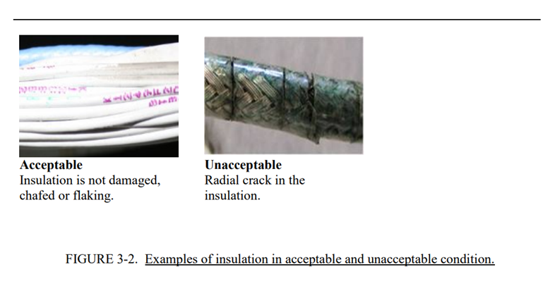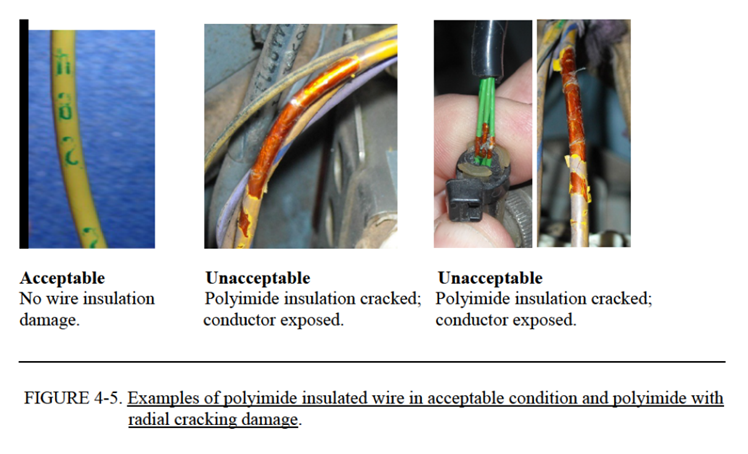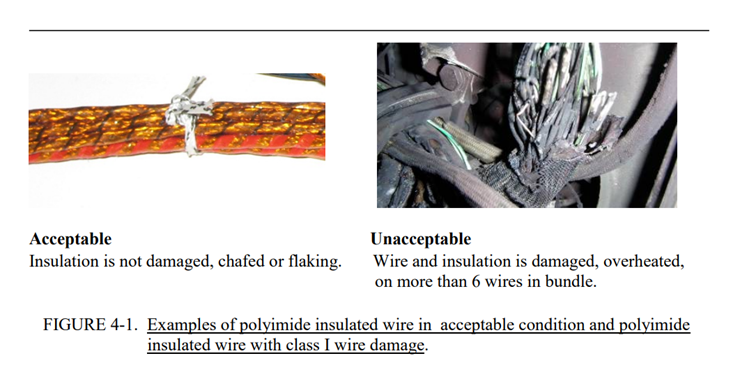 c.Kapton™绝缘导线/电缆的外部表面损伤只包括外部护套的损坏(称为表层剥落),不需要维修/维护。当内部(褐色)绝缘层出现切口或缺口时,需要对导线进行维修/维护。参见上述IV级(见图4-3和4-4)。