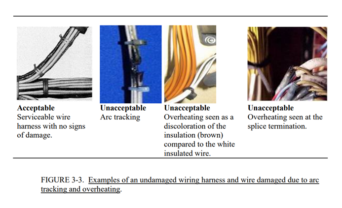 - 2.II级:电缆组件/线束/导线的中度(严重)损坏,包括布线损坏,其中5根或更少的导线受损,包括:编织物/屏蔽物/绝缘材料被切割、撕裂或分离,导体被磨损或切断,流体输送线路磨损,或8号及以上电力电缆对接地结构的磨损短路,或跳火印记/电弧迹象、烧毁/碳化(见图4-2)。