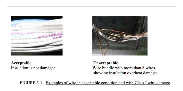 - 1. I级:电缆组件/线束/导线的重大(灾难性)损坏,包括6根或6根以上导线损坏,包括跳火印记/电弧迹象、烧毁/碳化或导线股丝烧伤/断裂。这种类型的损坏不能归类为二级或三级损伤,需要进行工程处理(见图4-1)。