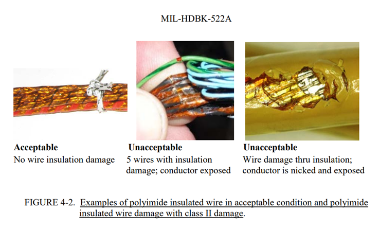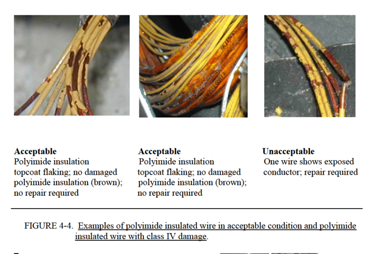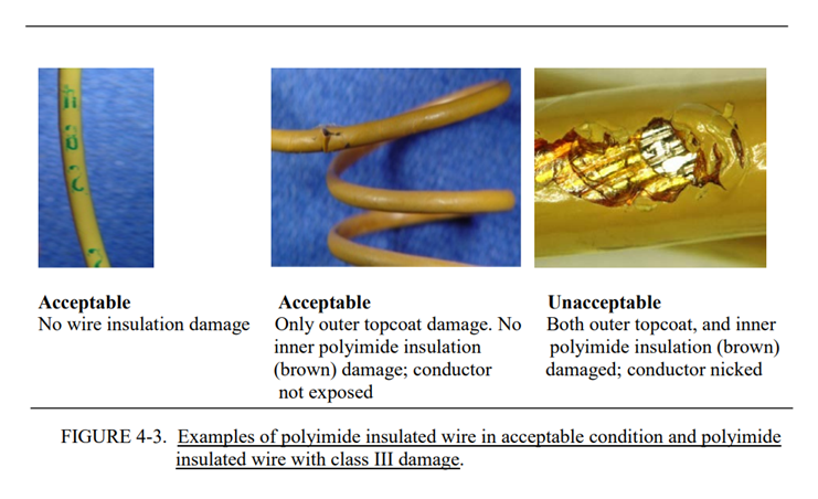 - 4. IV级:适用于M22759/80-92、M22759/180-192、M27500-XXDB-DR和M27500-XXWB-WR导线/电缆类型的多层绝缘导线(如复合材料)的表面损伤。复合导线/电缆外层的表面损伤。(PTFE生料带损伤暴露内部棕褐色绝缘体层(PI层)。