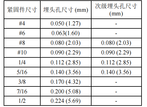 表A.1 埋头孔或次级埋头孔的最小材料厚度