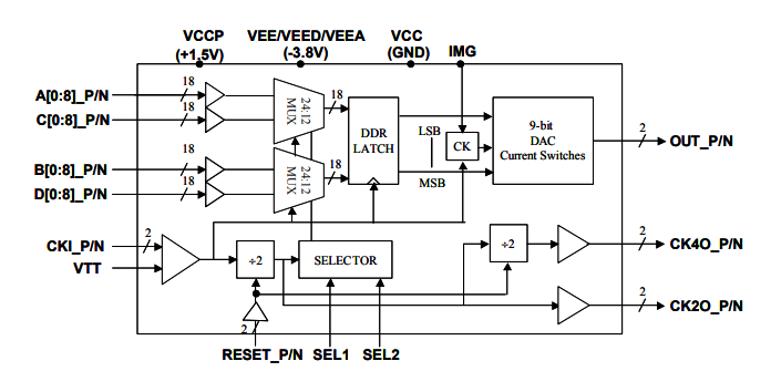 MD6639是一个高速9位数模转换器(DAC),与每个DAC输入位的4:1多路复用器集成。数字数据输入是带有片上100欧姆终端电阻的LVD。双采样率(DSR)DAC使其模拟输出采样率为时钟速率的两倍。该设备可以时钟高达5ghz,以实现10gsps的DAC模拟输出。互补模拟输出可与50瓦输出背面终端。提供除以2和除以4时钟LVDS输出(CK2O_P/N&CK4O_P/N)和采样相位选择(SEL1/SEL2),以简化相对于输入数据的采样相位对齐。提供一个IMG引脚来调整时钟驱动DAC的占空比,以最小化由于双重采样而产生的图像信号。