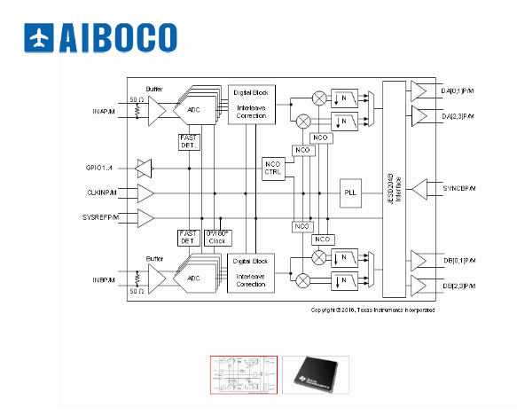 每个通道可以连接到一个双频带数字下变频器(DDC),每个DDC最多具有三个独立的16位数控振荡器(NCO),以实现相干跳频。此外,该ADC还配备了前端峰值和RMS功率检测器以及警报功能,以支持外部自动增益控制(AGC)算法。